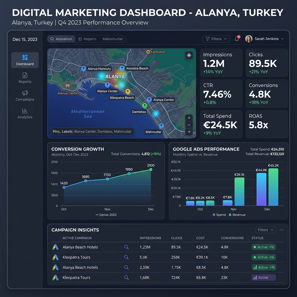Özellikle Alanya gibi spesifik bir lokasyonda, hizmet verdiğiniz bölgeyi (çap veya kilometre bazlı) hedefleyerek reklam bütçenizi en verimli şekilde kullanabilirsiniz. Örneğin bir rent a car firmasıysanız, sadece Alanya merkezde araç arayanları hedefleyebilir veya otel işletiyorsanız yurtdışındaki potansiyel turistlere doğrudan “Alanya tatili” aramalarında ulaşabilirsiniz. Doğru anahtar kelime seçimi, negatif kelime filtrelemesi ve optimize edilmiş reklam metinleriyle, rakiplerinizden her zaman bir adım önde ve müşterinizin tam karşısında olursunuz.
